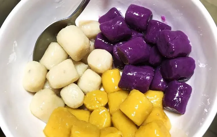 - Cho nước vào nồi sạch, đun sôi, sau đó thả lần lượt từng viên khoai vào luộc chín. Bạn nên luộc riêng từng loại khoai để chúng không bị phai và dính màu vào nhau. Các viên khoai chín sẽ nổi lên trên mặt nước. Lúc này, bạn vớt các viên khoai ra cho vào tô nước lọc lạnh để khoai không bị dính.