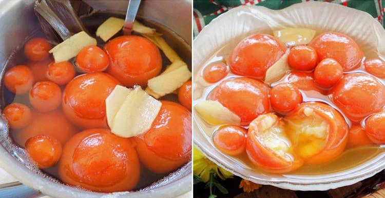 - Cho đường nâu, gừng vào 1 lít nước rồi nấu sôi. Vớt các viên trôi gấc từ tô nước lạnh cho vào nước đường đun nhỏ lửa khoảng 10-15 phút rồi tắt bếp.
