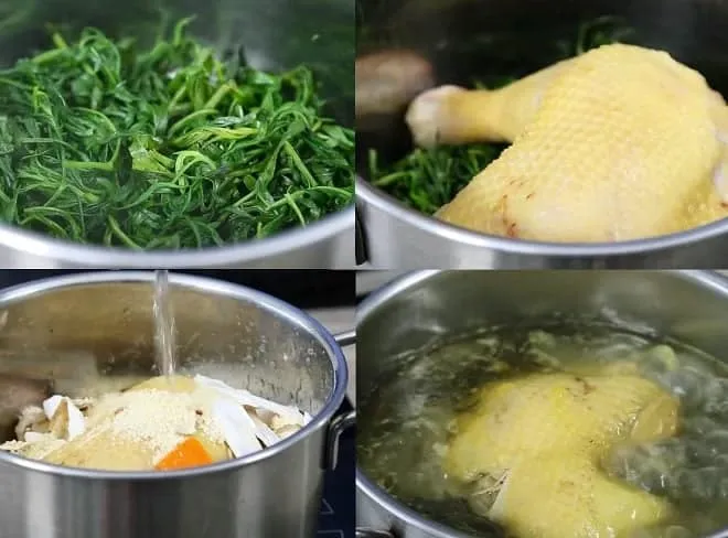 - Trong khi nước sôi, bạn nhớ vớt bỏ váng bọt để nước hầm gà trong và ngọt thanh hơn. Khi gà đã chín mềm, nêm nếm cho vừa ăn.