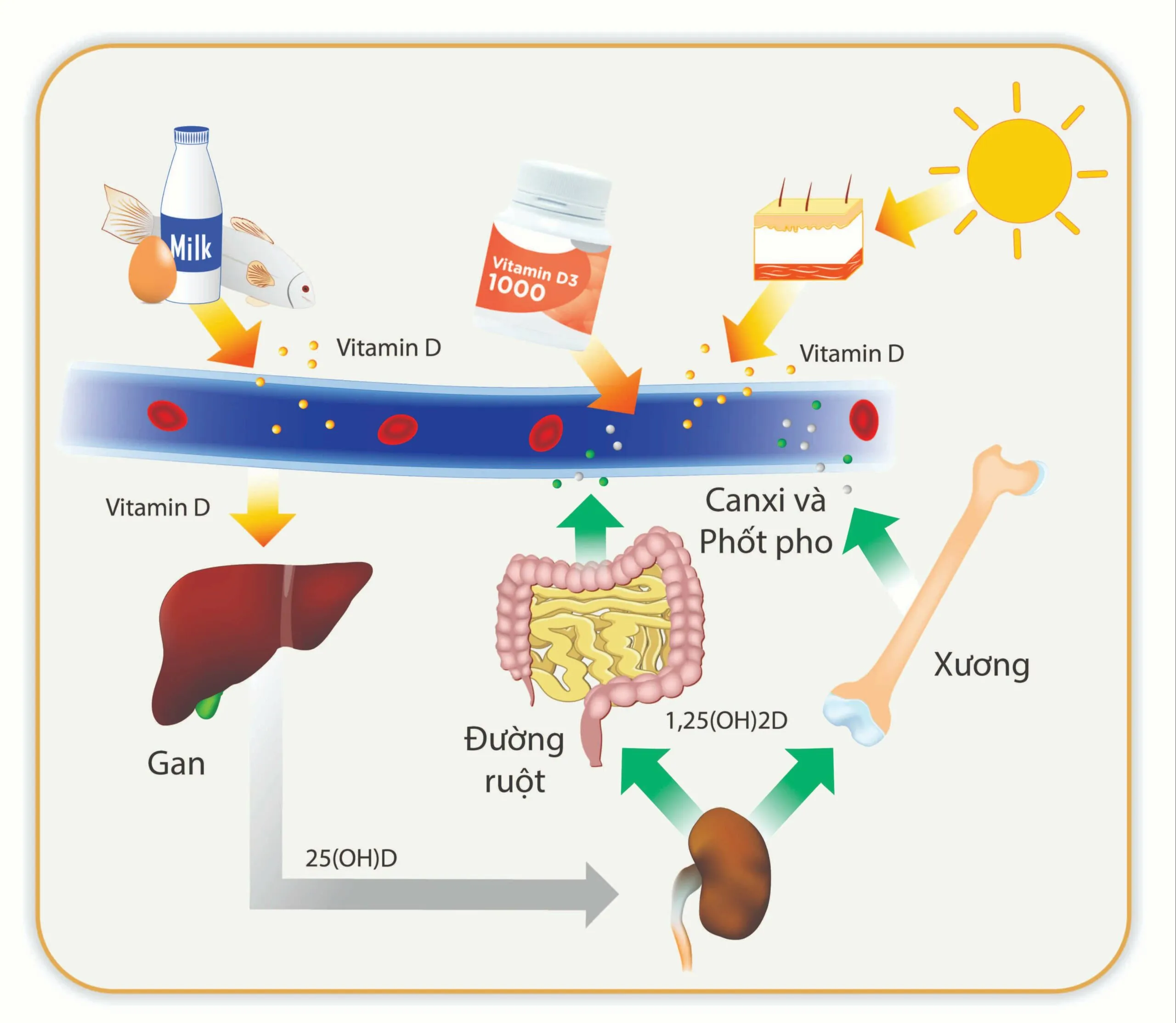 Ngoài ra, vitamin D còn có vai trò điều hòa nồng độ canxi trong máu. Nếu thiếu vitamin D, ruột không hấp thụ đủ canxi, làm canxi máu giảm. Khi đó, canxi có thể bị huy động từ xương ra để ổn định nồng độ canxi trong máu nên có thể dẫn đến loãng xương, thưa xương, xương dễ gãy…[18]