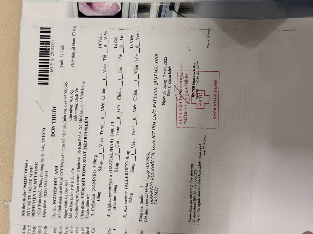 Sau khi khám chuyên khoa tai mũi họng thì em bác sĩ có cho nội soi và cho 2 đơn thuốc như hình sau khi em uống xong đơn thuốc thì triệu chứng về xoang: nhức đầu và nặng mặt nó đỡ nhiều tuy nhiên là em vẫn còn bị triệu chứng về sưng hạch hàm dưới bên trái (hạch mềm di chuyển, đau khi ấn vào, to bằng đầu ngón tay) và cảm giác râm ran ớn lạnh như sốt nhưng thực chất không có sốt nhiệt độ đo tầm khoảng 36,8 độ