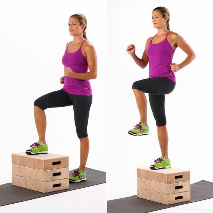 - Duỗi gối và hông để bước lên trên hộp. Sau đó, đặt chân còn lại lên hộp.