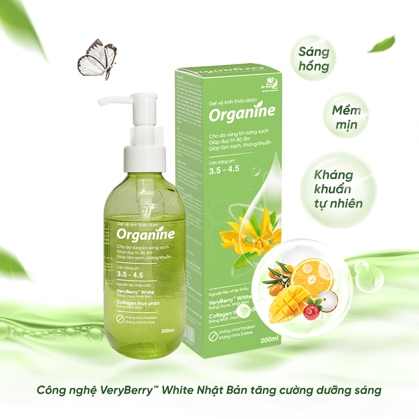 - Công nghệ VeryBerry WHITE với hỗn hợp chiết xuất từ 5 loại trái cây gồm xoài, vải, hắc mai biển, cam Unshiu và nam việt quất nhập khẩu Nhật Bản giúp ức chế sự tổng hợp melanin, chống oxy hóa và khử các gốc tự do. Qua đó thúc đẩy chu trình chuyển hóa da, giúp nuôi dưỡng da vùng kín luôn sáng hồng. Đây là công nghệ đột phá của Organine, tuy sinh sau đẻ muộn nhưng lại là dòng Gel vệ sinh thảo dược tiên phong trong tính năng dưỡng trắng.