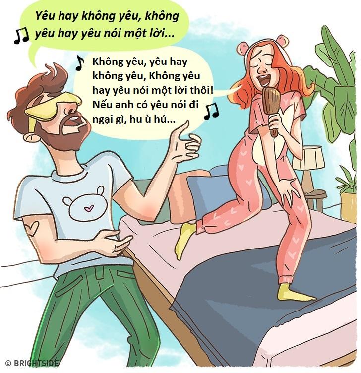 Chỉ cần một trong hai bạn yêu thích bài hát nào thì hiển nhiên người còn lại cũng thuộc luôn giai điệu bài hát ấy. Thậm chí, hai bạn còn thường xuyên mở “liveshow’ ca hát và nhún nhảy tại nhà mỗi khi rảnh rỗi. Đừng vội nghĩ điều này là ngớ ngẩn, vì hát thường xuyên còn mang lại nhiều niềm vui và lợi ích cho sức khỏe của bạn đấy!