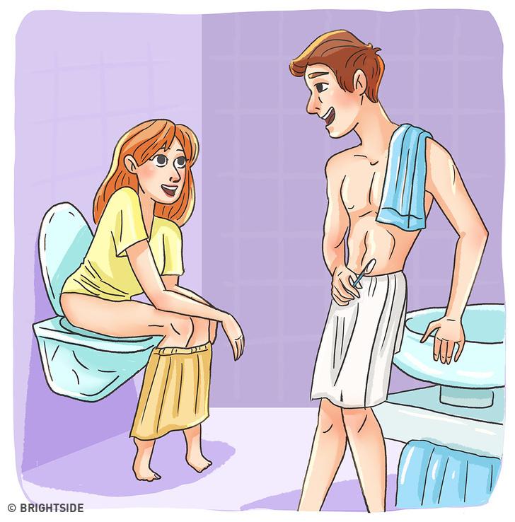 Một điều đặc biệt mà các cặp đôi hay làm cùng nhau chính là nói chuyện phiếm trong phòng tắm. Bạn chẳng còn e ngại việc nhà vệ sinh có đang bốc mùi hay không mà vẫn có thể thoải mái buôn chuyện cùng người ấy. Không chỉ vậy, cả hai cũng chẳng bao giờ khóa cửa mỗi khi vệ sinh cá nhân!