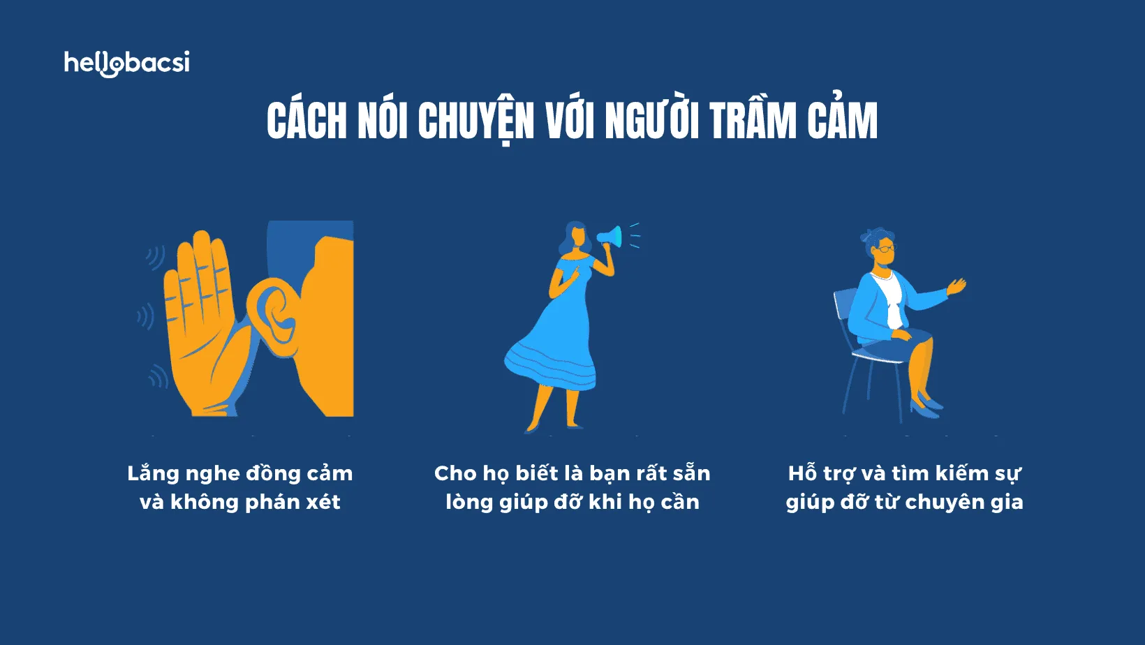 Có thể sẽ khó khăn thời gian đâu, bạn chỉ cần nhẹ nhàng nhắc họ rằng: “Mặc dù mình không thể hiểu hết những gì cậu đang trải qua, mình vẫn luôn ở đây để cậu có thể dựa vào và tìm tới bất kỳ khi nào cậu cần.” Điều này có ý nghĩa rất lớn đối với người đang đối mặt với bệnh trầm cảm.