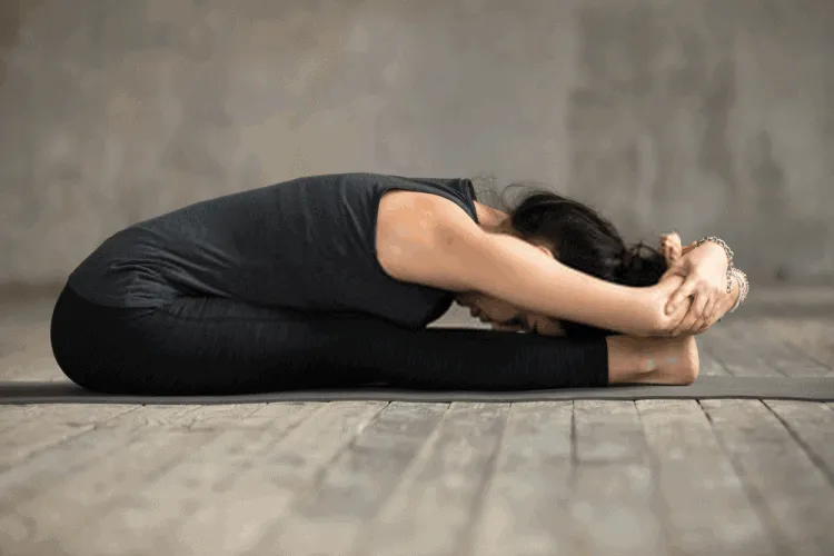 - Bước 2: Khi thở ra, bạn cúi người xuống, hai chân duỗi thẳng và từ từ đưa phần đầu về gần với đầu gối.